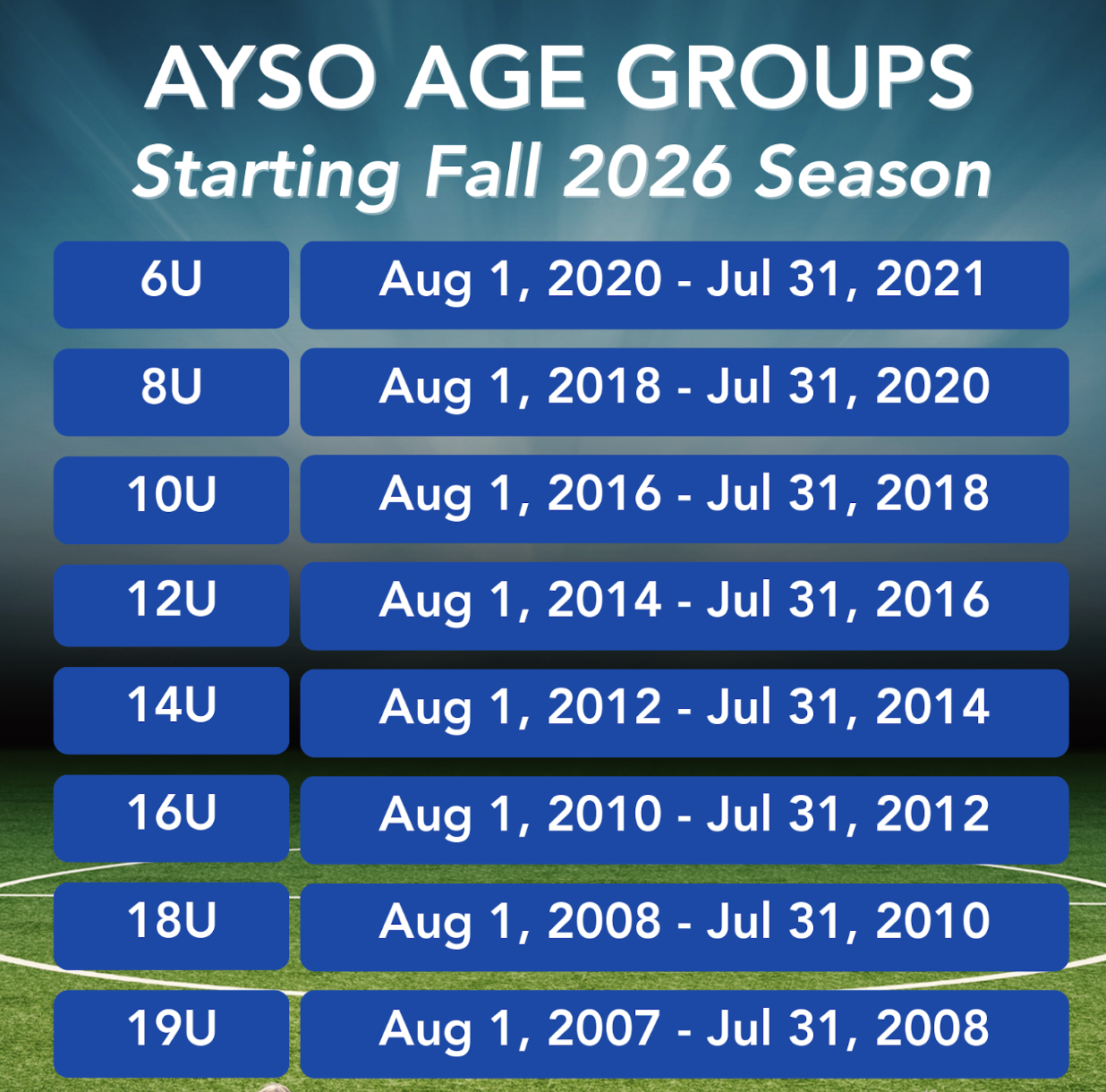 AYSO uses birth-year registration to align with US Soccer, the governing body for soccer in the US. Players are placed into a division defined by the calendar year of their birth. The registration system automatically places players in the correct division. See below for additional information.